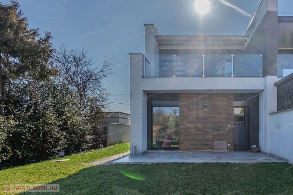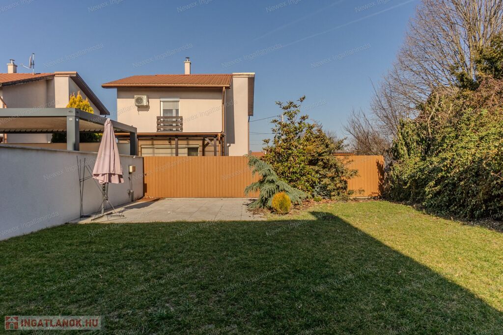 Az előkert térkövezett, a parkosított hátsókert automata öntözőrendszerrel felszerelt. A kert hátsó területén kialakított beton alap további exkluzív terasz vagy kültéri konyha megvalósítására ad lehetőséget.